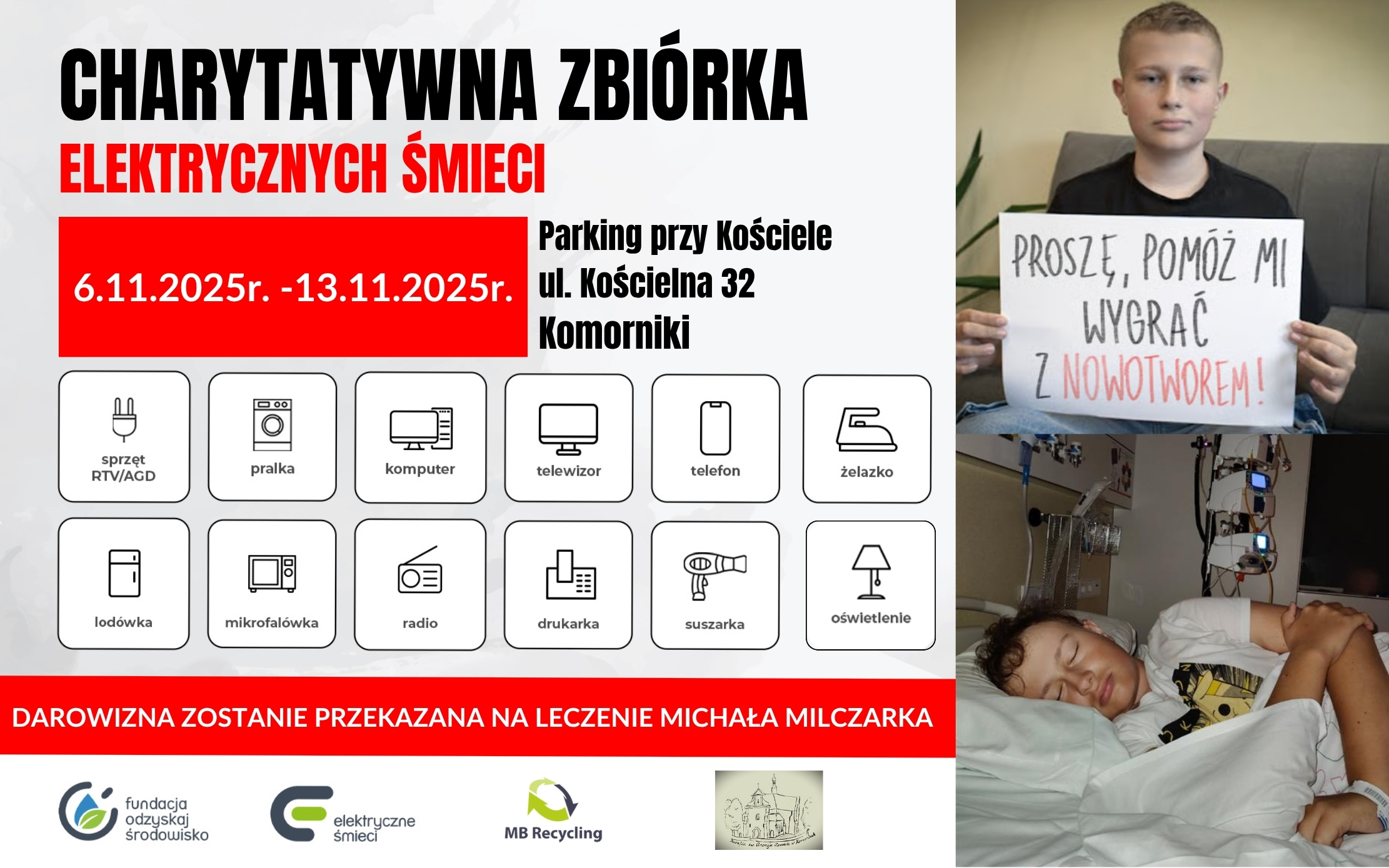 Stara pralka, niedziałający telefon czy komputer zalegający w piwnicy – te rzeczy mogą pomóc w zebraniu środków na terapię. Od 6 do 13 listopada 2025 r. w Komornikach odbędzie się charytatywna zbiórka elektrycznych śmieci, z której dochód zostanie przekazany na leczenie Michała Milczarka, nastolatka walczącego z neuroblastomą IV z przerzutami do kości i szpiku.