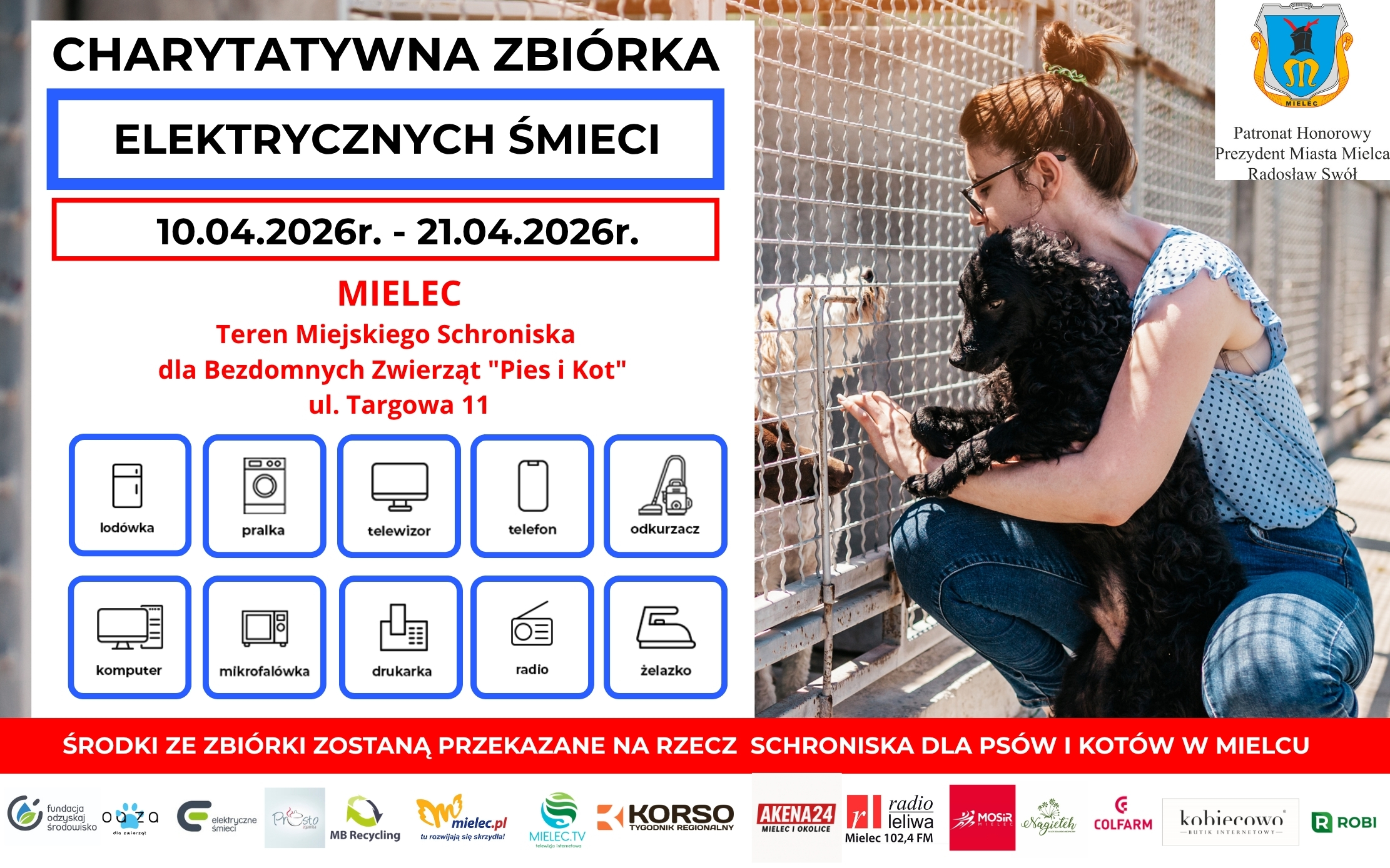 Od 10 do 21 kwietnia 2026 roku na terenie Miejskiego Schroniska dla Bezdomnych Zwierząt ,,Pies i Kot’’ w Mielcu (ul. Targowa 11) odbędzie się kolejna edycja charytatywnej zbiórki elektrycznych śmieci. Środki ze zbiórki zostaną przekazane na wsparcie podopiecznych schroniska – psów i kotów, które często trafiają tam po trudnych doświadczeniach: porzucone, chore, zaniedbane lub odebrane z niewłaściwych warunków.