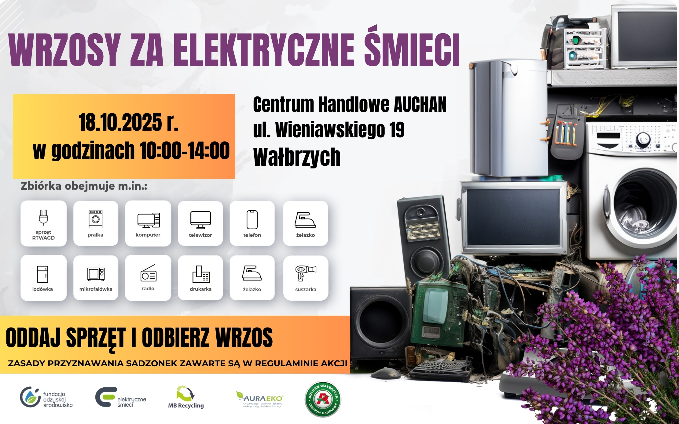 Mieszkasz w Wałbrzychu, a w Twoim domu zalegają zużyte sprzęty elektryczne i elektroniczne? Już 18 października 2025 r. od godziny 10:00 do godziny 14:00 na terenie Centrum Handlowego Auchan przy ul. Wieniawskiego 19 w Wałbrzychu odbędzie się miejska zbiórka elektrycznych śmieci.