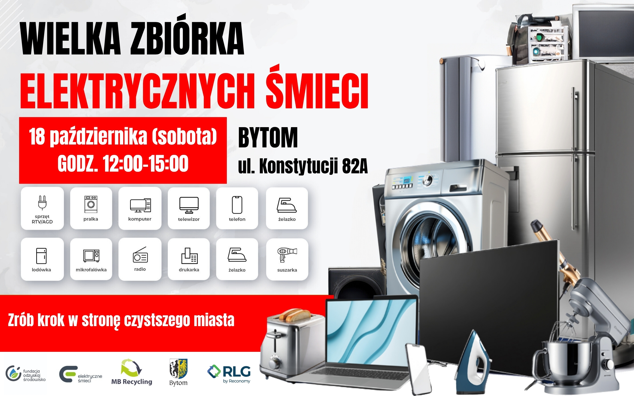 18 października w godzinach od 12:00 do 15:00 mieszkańcy Bytomia i okolic będą mogli bezpłatnie pozbyć się niepotrzebnych urządzeń elektrycznych i elektronicznych. Punkt zbiórki zostanie uruchomiony przy ul. Konstytucji 82A na Karbiu w Bytomiu (obok marketu DINO).
