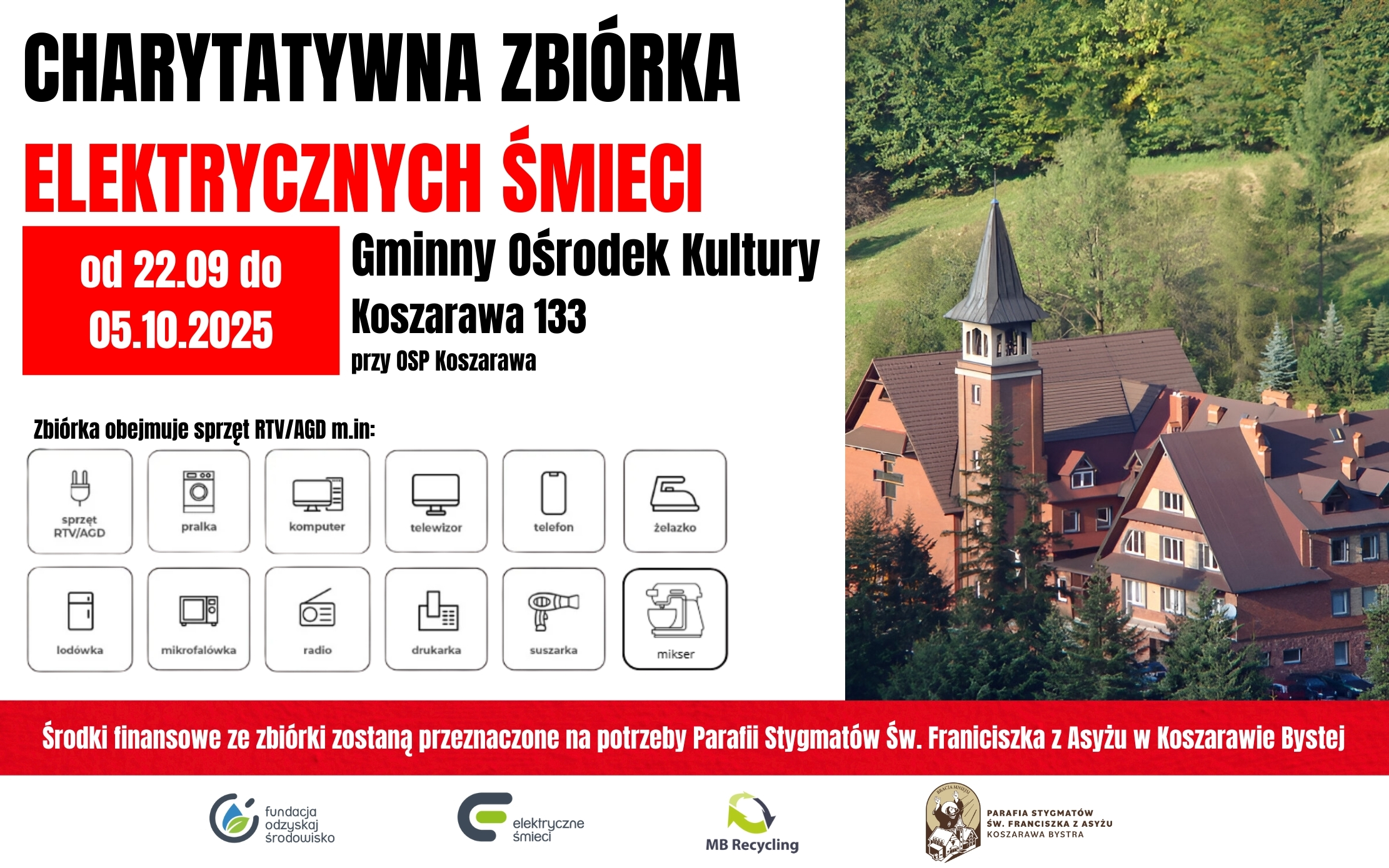 Mieszkańcy Koszarawy i okolic będą mogli pozbyć się elektrycznych śmieci wrzucając je do kontenerów ustawionych przy Gminnym Ośrodku Kultury w Koszarawie (przy OSP). Za kilogram zużytego sprzętu elektrycznego i elektronicznego, parafia otrzyma środki finansowe, które zostaną przeznaczone na potrzeby kościoła.