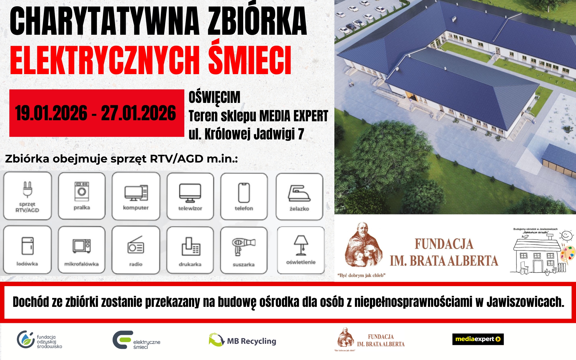 Od 19 do 27 stycznia 2026 roku przy sklepie Media Expert w Oświęcimiu na ul. Królowej Jadwigi 7 odbędzie się zbiórka zużytego sprzętu elektrycznego i elektronicznego. Masz w domu zepsuty telewizor, starą pralkę, nieużywany od lat komputer lub telefon? Zrób porządek i przynieś je na zbiórkę elektrycznych śmieci. Środki zebrane podczas akcji zostaną przekazane na budowę ośrodka „Opiekuńcze Skrzydła” Fundacji im. Brata Alberta w Jawiszowicach.
