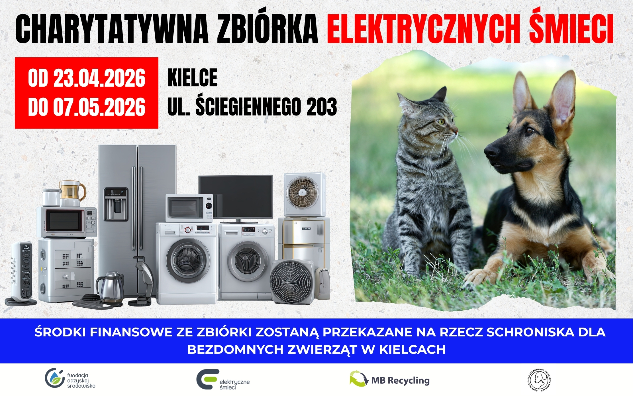 W dniach od 23 kwietnia do 7 maja 2026 roku w Kielcach odbędzie się kolejna edycja charytatywnej zbiórki elektrycznych śmieci, z której dochód zostanie przeznaczony na wsparcie Schroniska dla Bezdomnych Zwierząt w Kielcach. Mieszkańcy miasta i okolic będą mogli bezpłatnie przekazać zużyty sprzęt elektryczny i elektroniczny na terenie schroniska przy ul. Ściegiennego 203.